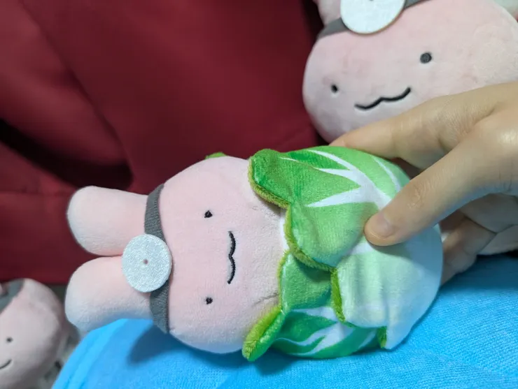 ベッド脇のカーテンにはぬいぐるみバッジたちがたくさんつけられていて、こちらを可愛く見下ろしている。